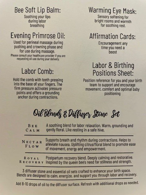 Crafted in small batches with care and intention, each blend features high-quality essential oils paired with thoughtful tools - like diffuser stones, labor combs, soothing lip balms, etc.… to create a portable sanctuary of support for birthing women and their care teams.